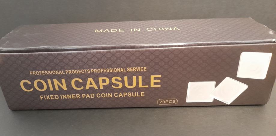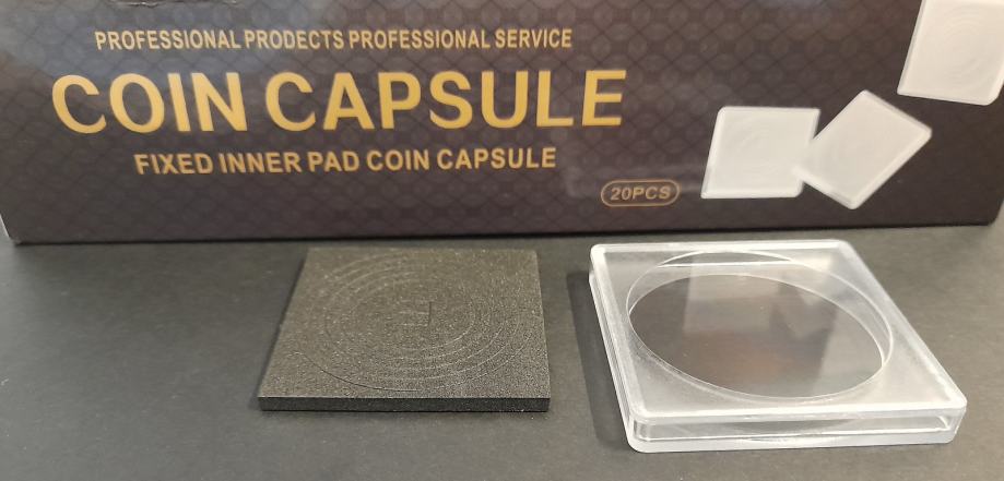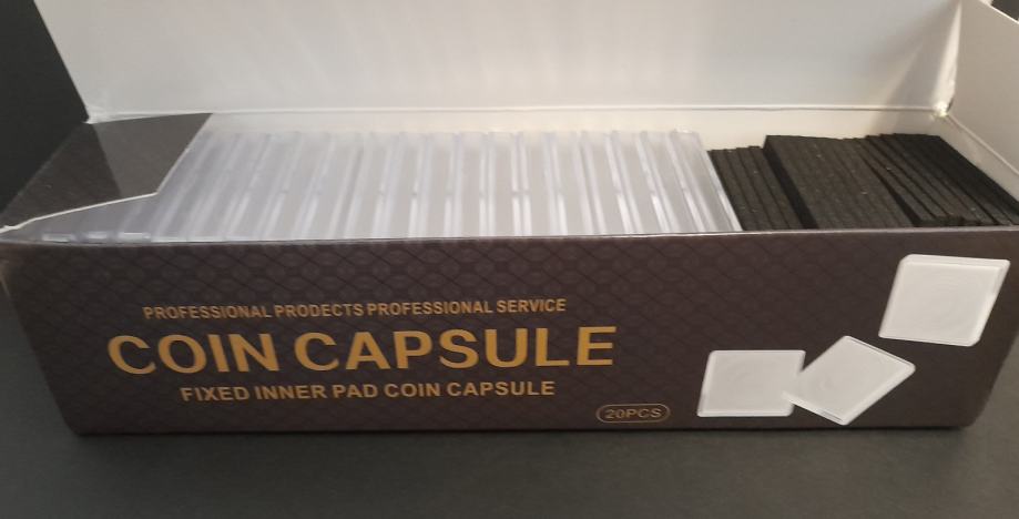 Set 20 quadrum kapsula za kovanice promjera 20 mm do 40 mm (idealno za kovanice 25 HRK, 2 EUR, srebrnjake, medalje...) + KUTIJA + UMETCI