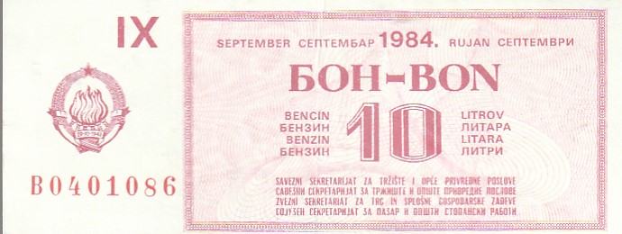 SFRJ BON ZA 10 L BENZIN GORIVA 1984 G RUJAN