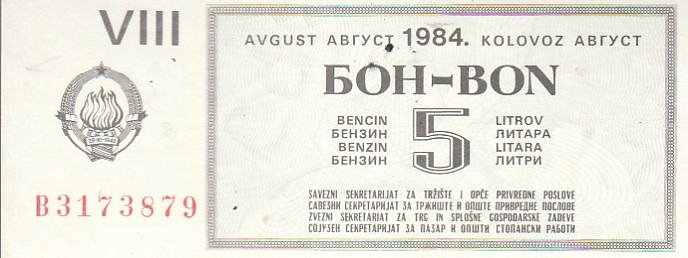 SFRJ BON ZA 5 L BENZIN GORIVA 1984 G KOLOVOZ