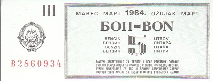 SFRJ BON ZA 5 L BENZIN GORIVA 1984 G OŽULJAK