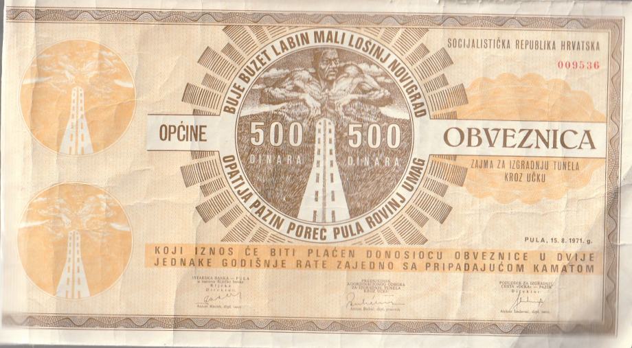 SR HRVATSKA OBVEZNICAZAJMA ZA IZGRADNJU TUNELA KROZ UČKU 500 DIN 1971