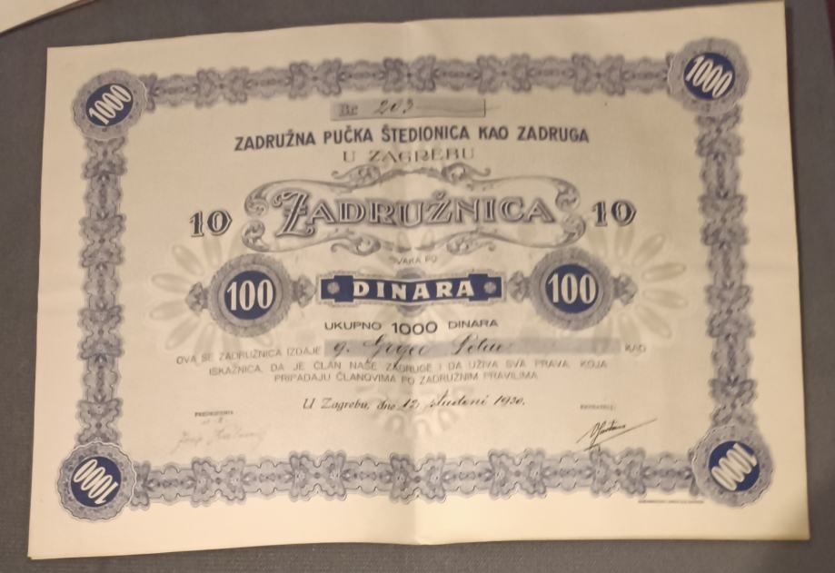 Zadružna pućka štedionica kao zadruga u Zagrebu, Zadružnica 100 dinara, ukupno, 1000 dinara.
