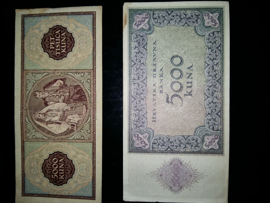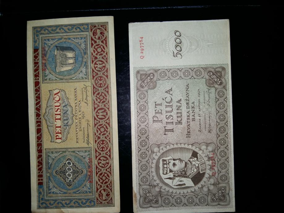 HRVATSKA DRŽAVNA BANKA 1943. god. - 1 od 5000 kuna izdana 15. srpnja 1943. god. serija Q za 450 kn i 1 od 5000 kuna izdana 01. rujna 1943. god. serija E , za 300 kn, obadvije u odličnom stanju,uščuvane, kont. na mob. 095 510 6921