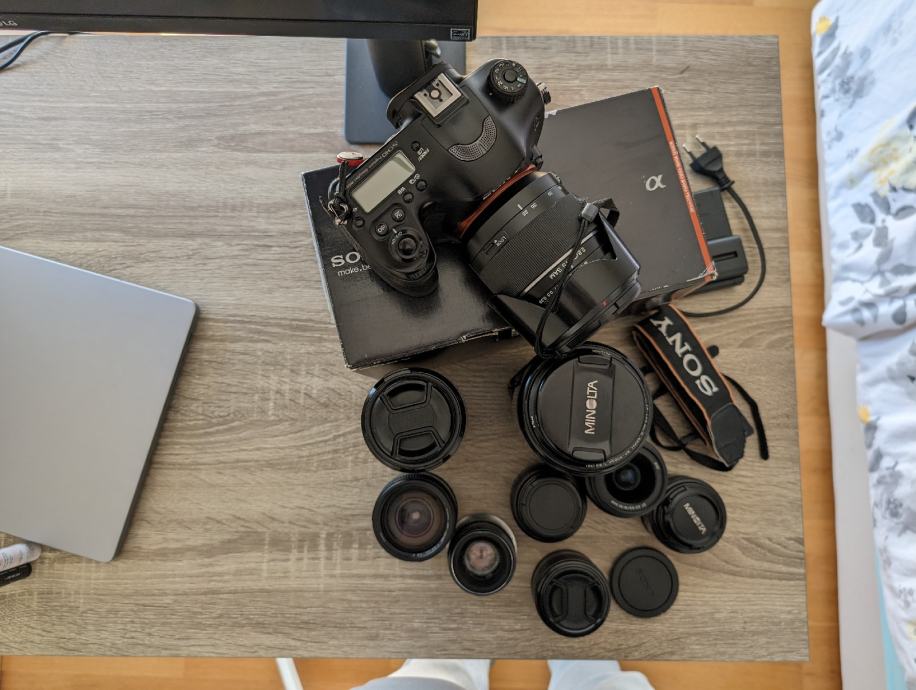 Helios 44-2 with m42 to A-mount converter. Has some scratches and dents. Lenses are perfectly fine.