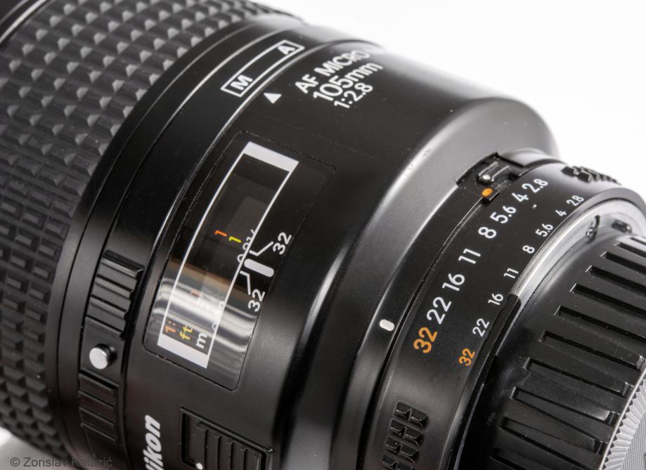 Nikon 105 mm AF Micro ima zaslon sa sedam lamela za detaljno fokusiranje .