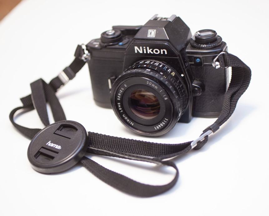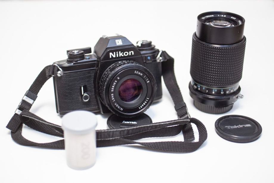 Napomena: kućište Nikon EM i Tokina objektiv sa fotografija su prodani, u ponudi je ostao samo objektiv Nikon serie E 1,8/50 mm .