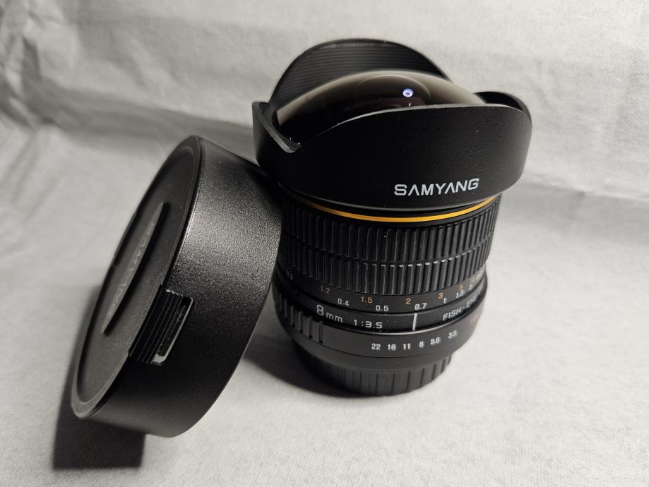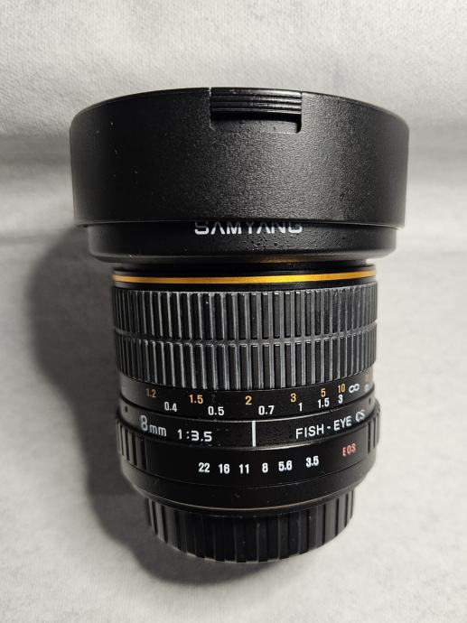 Prodajem objektiv Samyang 8 mm, ultraširoki objektiv (fisheye) s ručnim fokusom za DSLR tijela (Canon APS-C mount). Na plastičnom kućištu vide se manji tragovi korištenja, ali optika je u besprijekornom stanju.