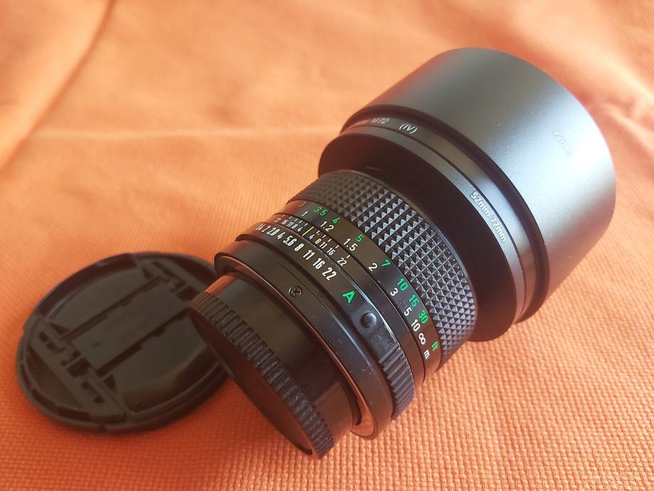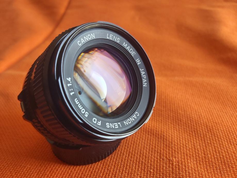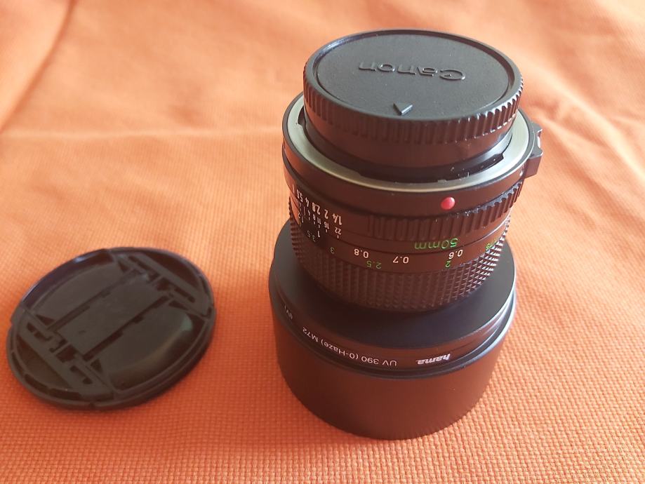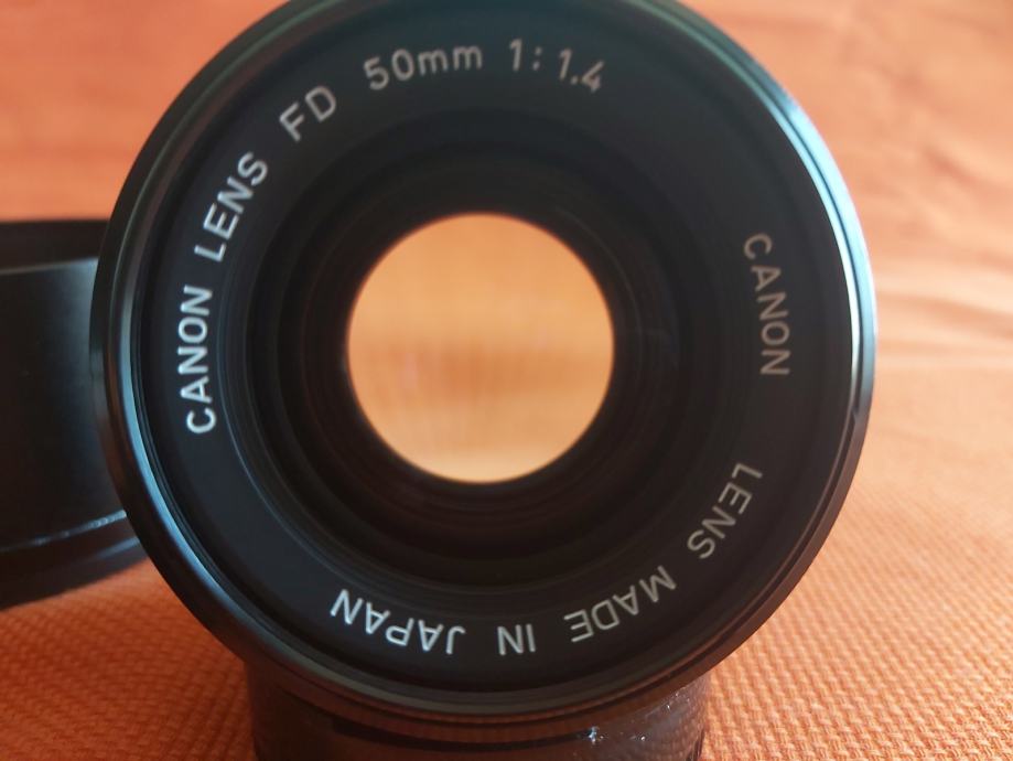 Prodajem japanski (made in Japan) objektiv oznake Canon lens fd fiksne žarišne duljine od 50 mm, najvećeg otvora blende od f/1.4, sa metalnim sjenilom, zaštitnim 72mm HAMA filterom, step up 52mm na 72mm prstenom, pripadajućim poklopcima u odličnom stanju.