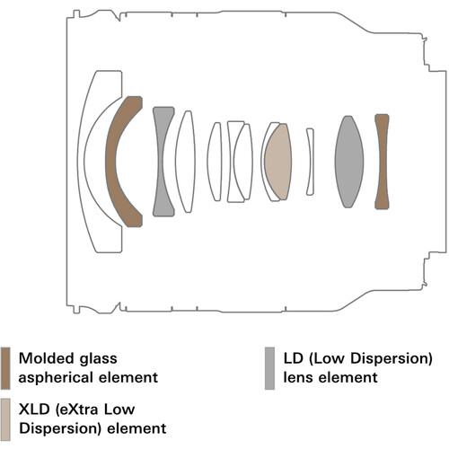 XLD (eXtra Low Dispersion), LD (Low Dispersion), and GM (Glass-Molded Aspherical) elements greatly reduce color fringing, chromatic aberrations, and image distortion throughout the zoom range for improved clarity and color accuracy.