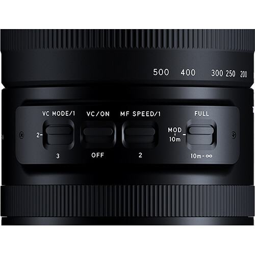 VC image stabilization facilitates shooting handheld at the 500mm ultra-telephoto position, with three modes: standard, panning, and framing priority.