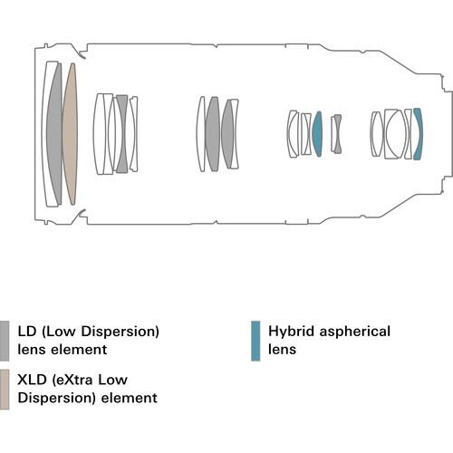 XLD (eXtra Low Dispersion), LD (Low Dispersion), and GM (Glass-Molded Aspherical) elements greatly reduce color fringing, chromatic aberrations, and image distortion throughout the zoom range for improved clarity and color accuracy.
