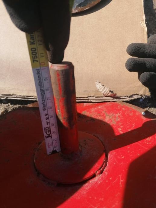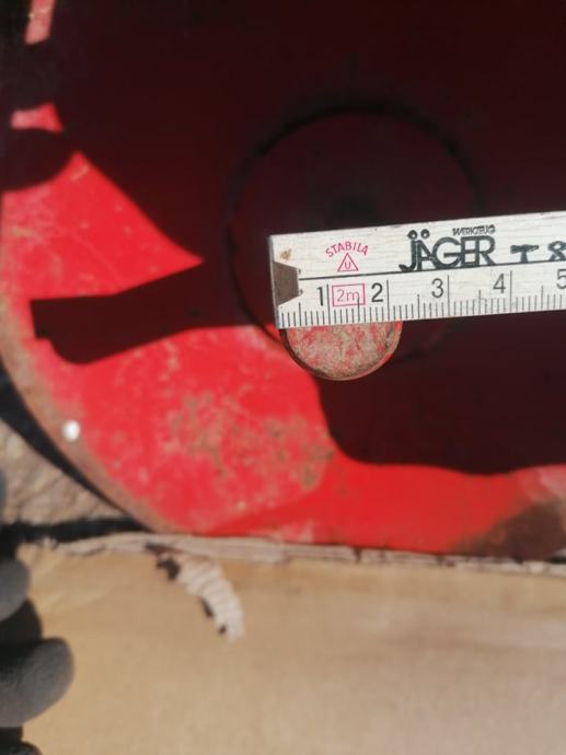 Vanjski promjer crvenog tanjura 26 cm, promjer osovine koja ide iz tanjura 20 mm, visina osovine 10 cm. Cijena 250 kn.
