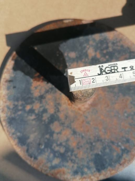 Vanjski promjer crnog tanjura 18 cm, promjer osovine koja ide iz tanjura 18 mm, visina osovine 8 cm. Cijena 200 kn.