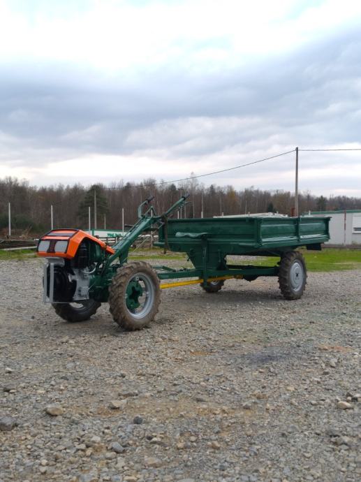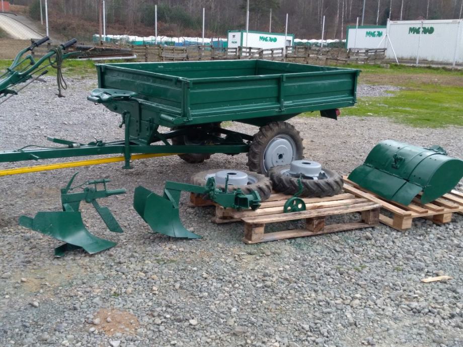 Uz motokultivator idu svi priključci, prikolica sa pogonom, plug za oranje, plug izorač, 2 rezerna kotača sa felgama, utezi, pomoćni kotačić, rezerni NOVI noževi za frezu.