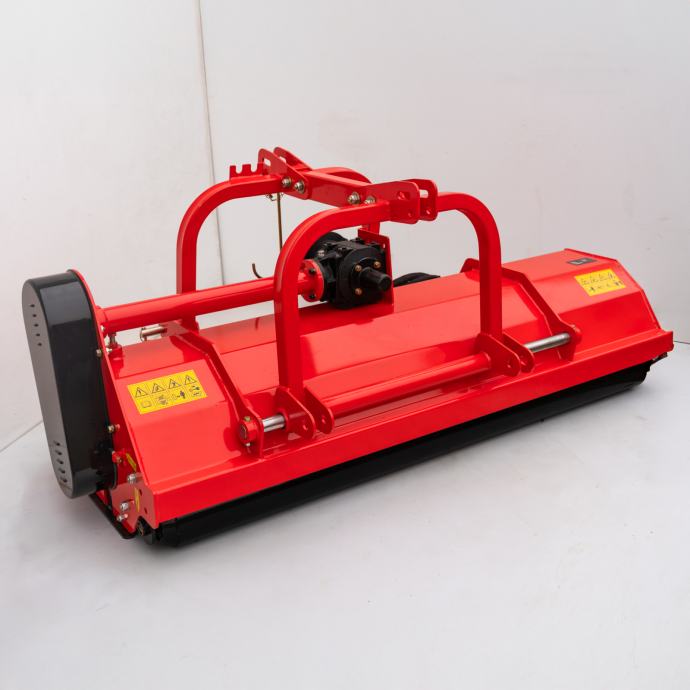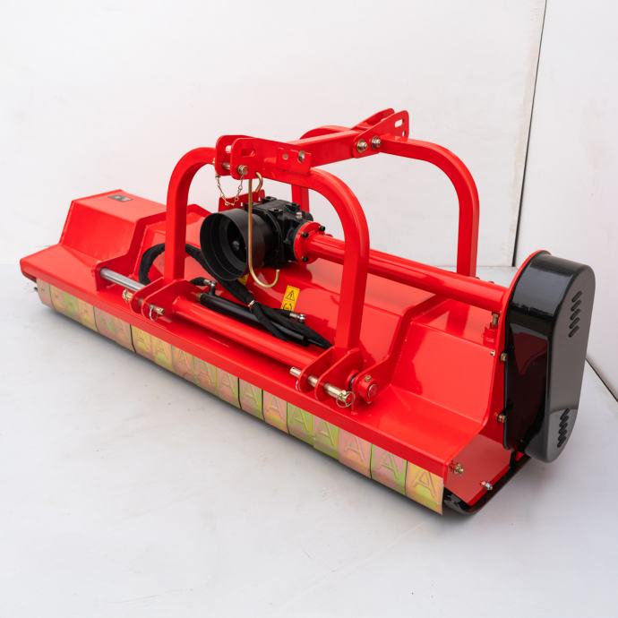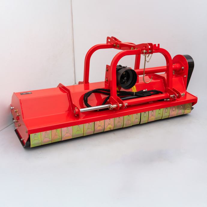 Malčer je opremljen s dvadeset snažnih čekića i četiri remena, što omogućuje učinkovito i ujednačeno malčiranje čak i gušće vegetacije. Hidraulični pomak omogućuje brzo podešavanje položaja tijekom rada, a reverzibilni priklop omogućuje korištenje malčera sprijeda ili straga na traktoru, čime se povećava prilagodljivost u različitim radnim uvjetima. Podesivi stražnji valjak i klizači osiguravaju stabilan kontakt s tlom i ravnomjernu visinu reza. Velika komora i široki izlazni otvor omogućuju nesmetan protok materijala bez zastoja, dok spojka u reduktoru štiti prijenos snage od preopterećenja.