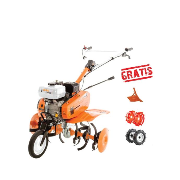 DAC motorna kopačica DAC 7000ACC1 s dvosmjernim mjenjačem naprijed i nazad. Ruris korisnicima nudi snažnu i učinkovitu motornu kopačicu za obradu tla u plastenicima ili vrtovima. Za manje od 30 minuta površina od 500 četvornih metara spremna je za sijanje ili predsjetvu. Za uske prostore na kraju reda u plastenicima, vrtovima, kopačica se može okrenuti upravljanjem mjenjačem na poleđini i na taj način DAC kopačica ispunjava sve radne uvjete i u skučenim prostorima. DAC kopačica ima 25% veći moment prijenosa u rasponu snage od 5,5 KS do 7 KS uz konstantnu štedljivu potrošnju od 1,1 litara benzina na sat. Svi modeli kopačica imaju kao svojstvo prijenosni sustav, vuča (pogonska osovina) na kojoj su transportni kotači ili kopači pričvršćeni vijcima (ovisno o njihovoj upotrebi). Sve Motorne kopačice – Freze su prvenstveno namijenjene za funkciju kopanja uz pomoć originalnih nastavaka iz ponude proizvođača Ruris sa zakovicama koje se pričvršćuju vijcima na pogonsku osovinu.