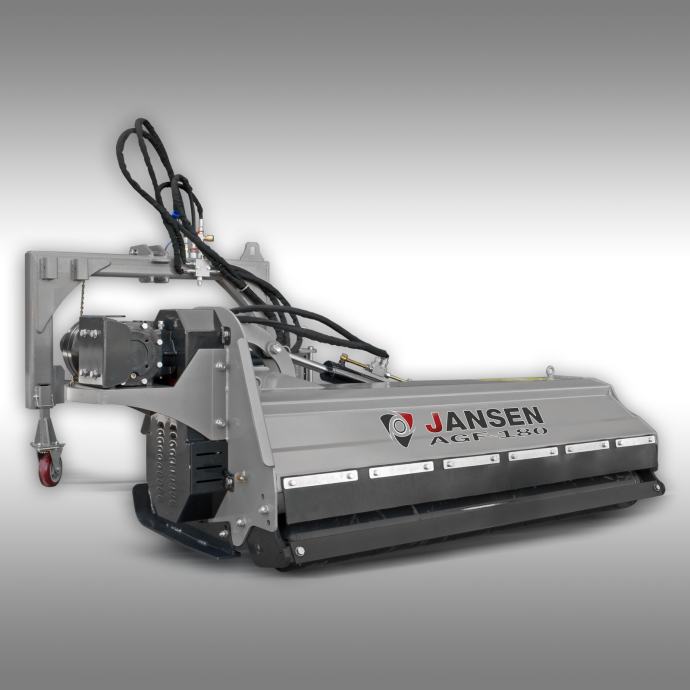 Traktorski malčer Jansen AGF-180 radne širine 178 cm, pogon na kardan traktora, bočne konstrukcije. Priključak je standardni u tri točke. Malčer je snažne konstrukcije sa snažnim rukama, robusnim mjenjačem i teškim čekićima spiralno postavljenim na snažnu osovinu. Malčer je opremljen hidrauličnim pomicanjem lijevo/desno i nagibom gore/dolje.