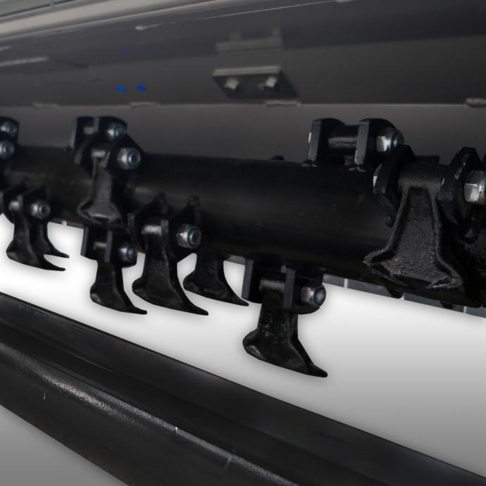 Snažan, robustan reduktor. 28 posebno kaljenih oštrica čekića težine 0,8 kg/kom, spiralno montiranih oko snažne osovine.