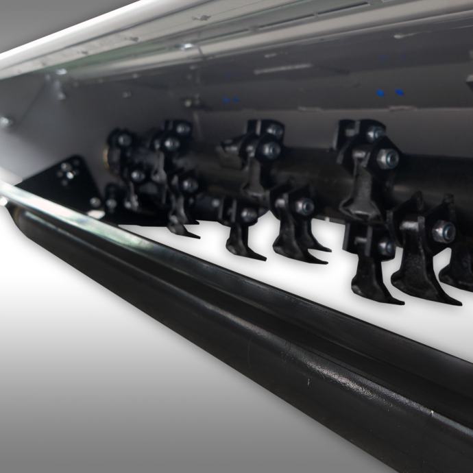 Snažan, robustan reduktor. 32 posebno kaljene oštrice čekića težine 0,8 kg/komad, spiralno montirane oko snažne osovine.