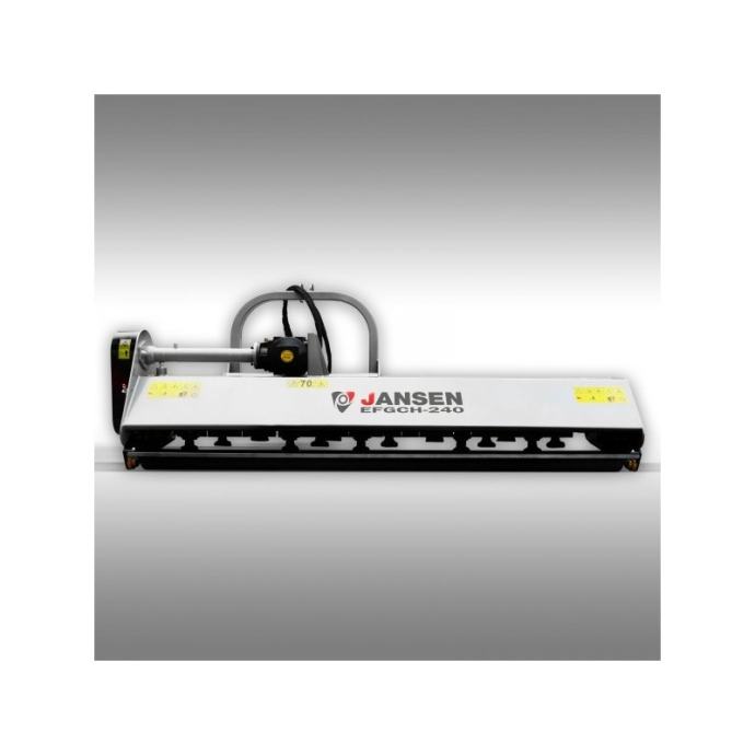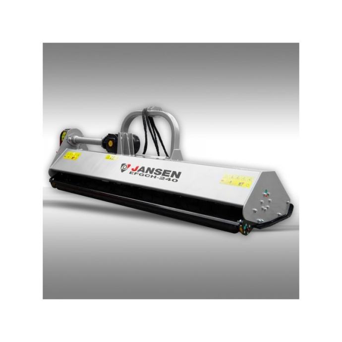 Traktorski malčer Jansen EFGCH-240 radne širine 239cm, pogonjen kardanskim vratilom traktora. Priključak je standardni u tri točke. Malčer ima snažnu konstrukciju s robusnim mjenjačem i teškim čekićima spiralno postavljenim na snažnu osovinu. Malčer je također opremljen hidrauličnim bočnim pomicanjem lijevo/desno.