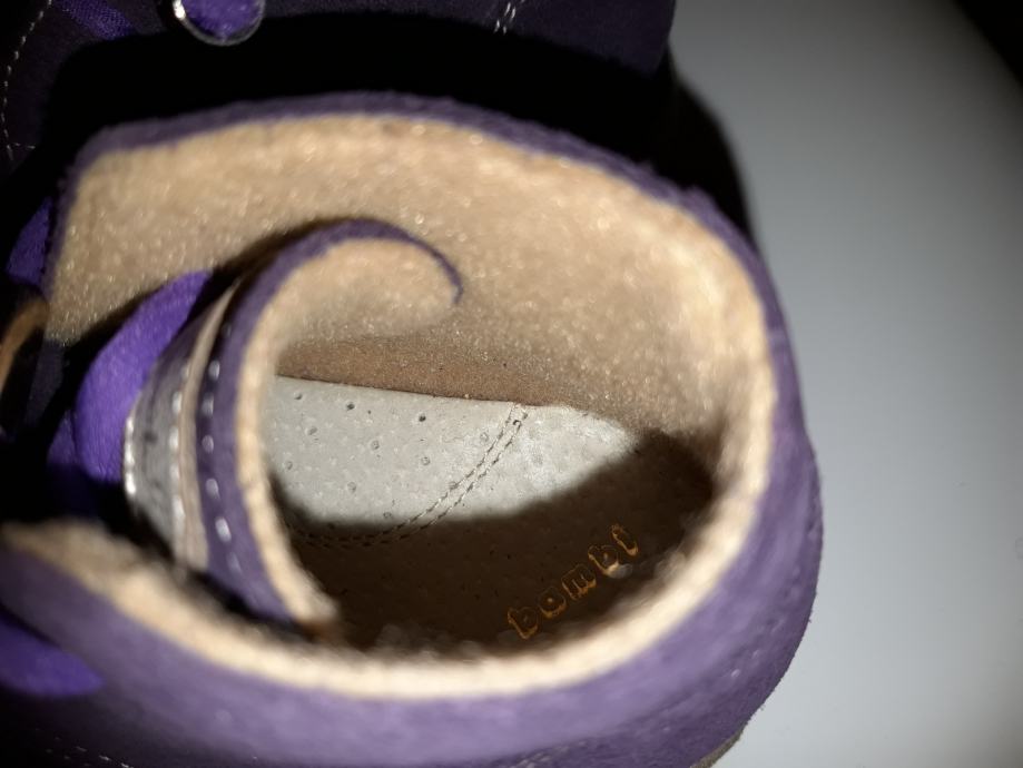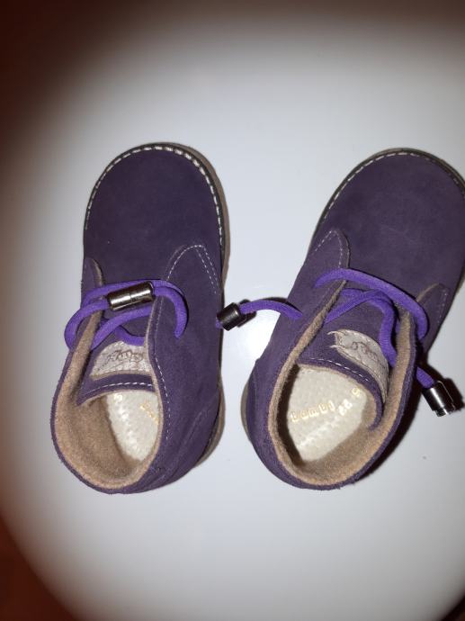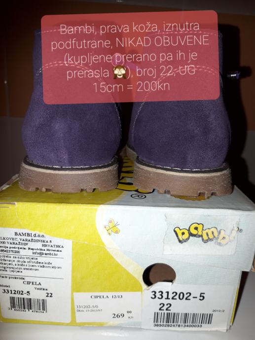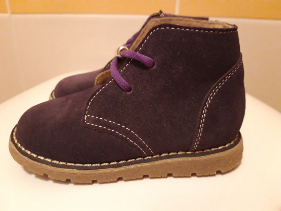 Bambi, tamno ljubičaste zimske gležnjače od prevrnute kože, podstavljene za zimu, nikad obuvene jer su kupljene prerano pa ih je djevojčica prerasla.