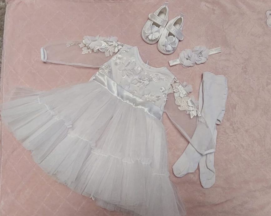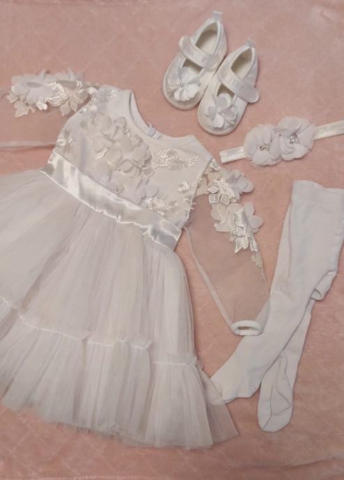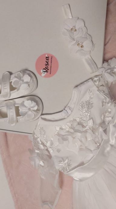 Haljina nošena samo za krštenje, proizvedena u Hrvatskoj, veličina 68. Uz nju poklanjam cipele, trakicu za glavu i štrample.