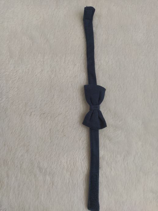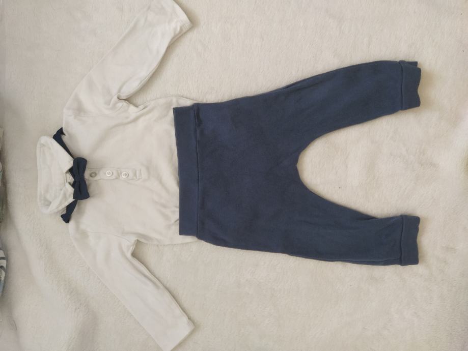 Komplet se sastoji od tamno plavoj hlačica, bijelog bodija i tamno plave leptir mašne. Obučeno jedanput. Veličina je 86.