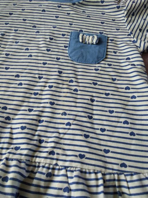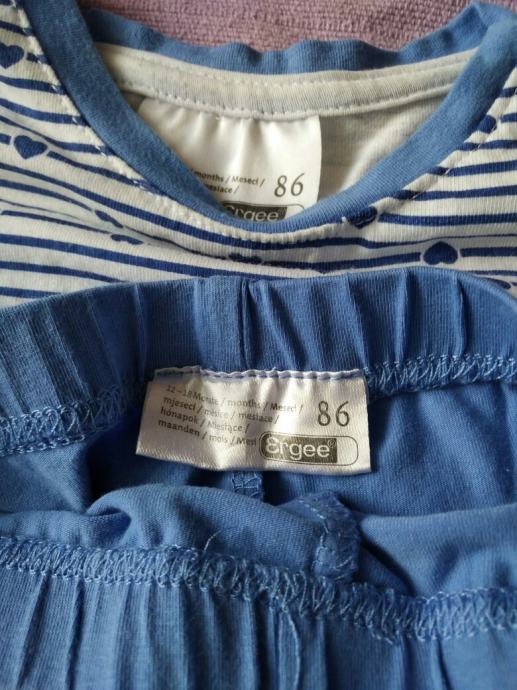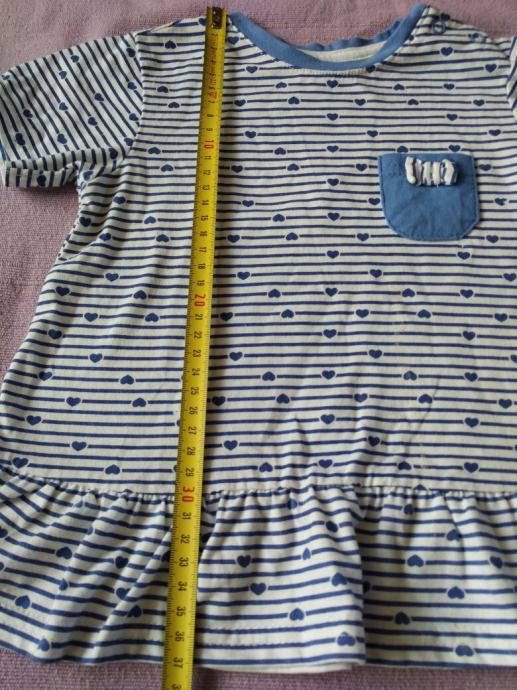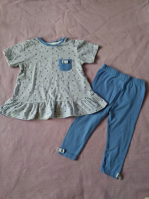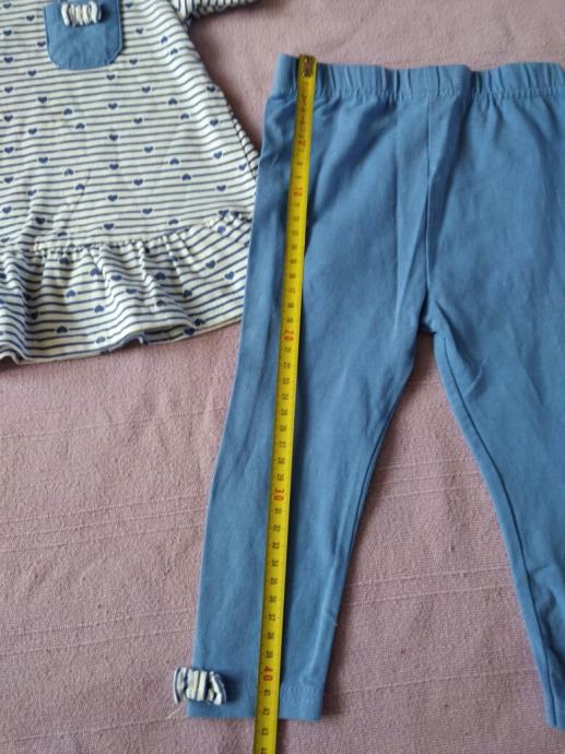 Komplet majica / tunika i hlače tajice za curice br. 86, NOVO, nenošeno, samo oprano, majica plavo bijele boje, na prugice, sa malenim srcima, dužina cca 37cm i plave hlačice sa mašnicama na dnu svake nogavice, dužina cca 42.5cm.