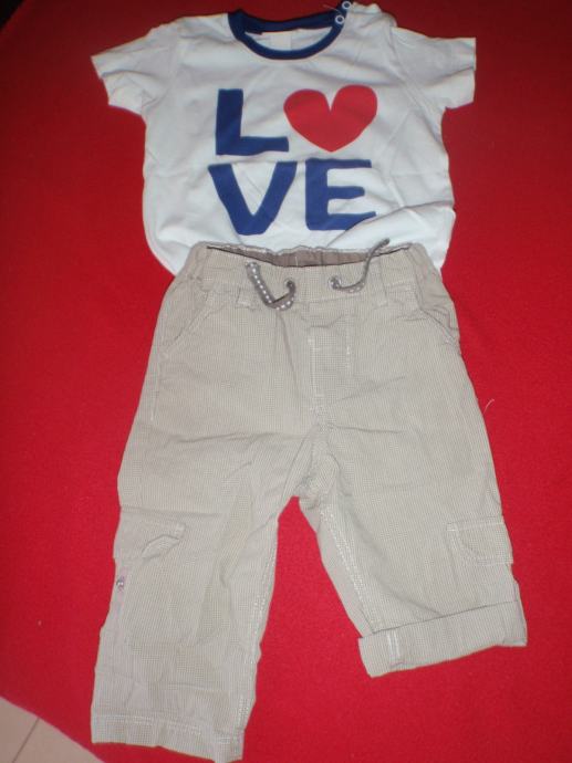 Lot se sastoji od majice na kratke rukave prljavo bijele boje sa natpisom LOVE i hlača dugih koje se mogu podfrknuti na 3/4 imaju drukere sa strane. Hlače su beige boje sa sitnim kockicama, sa strane imaju džepove. Sve od pamuka i sve H&M. Veličina 80, ali nosivo i sa 86. Savršeno očuvano, bez oštećenja i flekica. Pogledajte moje ostale oglase.