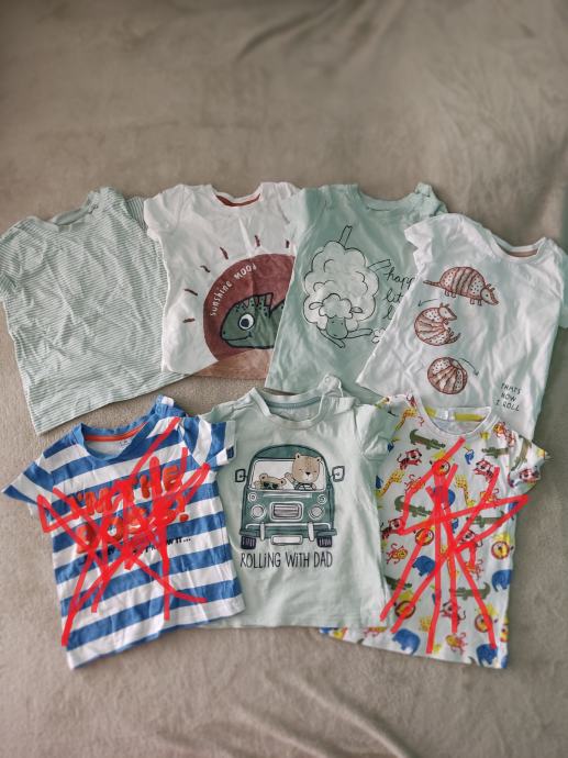 Lot majica kratkih rukava broj 86. Ukupno 5 komada. Imaju mrljice i zato je cijena za sve 5 eura. U Zagrebu i Karlovcu moguća je primopredaja. Pogledajte i ostale moje oglase, na više kupljenih stvari popust.