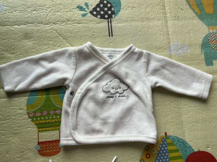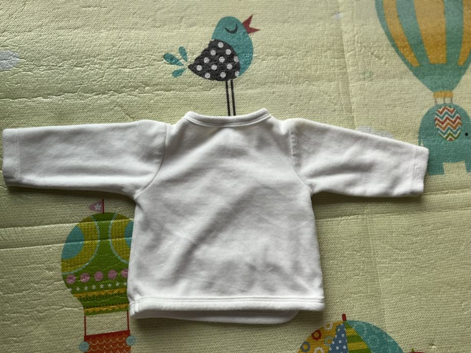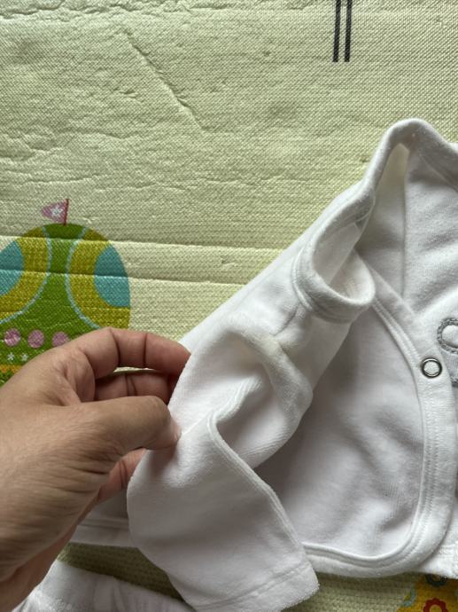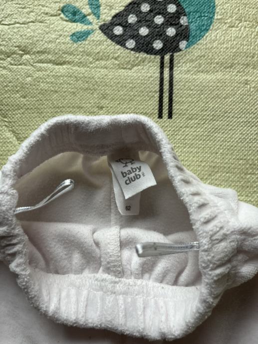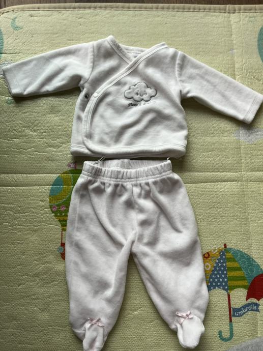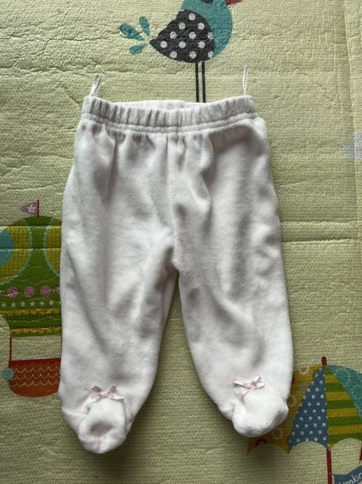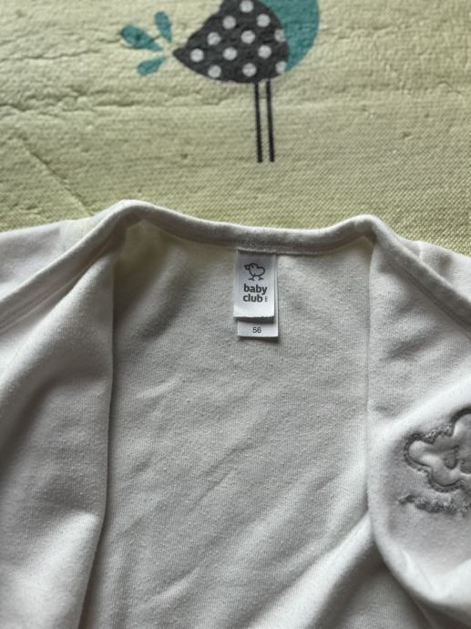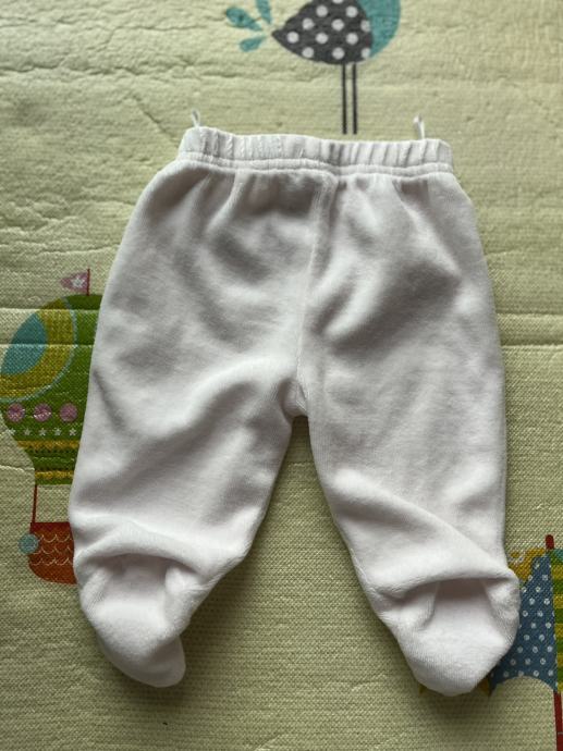 Plišani bijeli set majica i hlače sa stopalima 56 / 62, majica je 56 Baby club, sitna flekica na ramenu, pokušala sam uloviti na slici ali slabo se vidi, hlače Baby club 62, nošeno obadvoje na 56 / 62