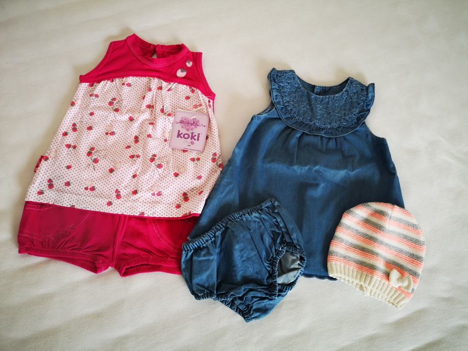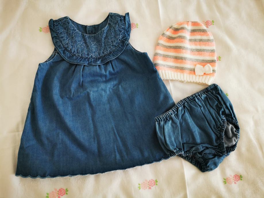 Zara traper haljinica i pripadajuće gaćice deklarirane vel. 74. Nova kapica i rozi ljetni kompletić gratis. Dužina leđnog dijela mjereno od ramena do ruba haljinice je 36 cm. Nošena 2x.