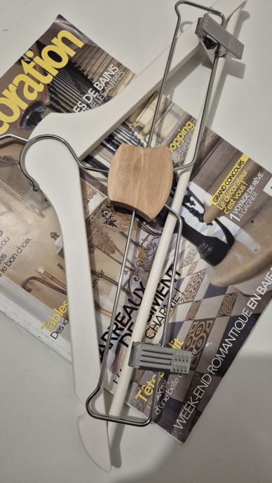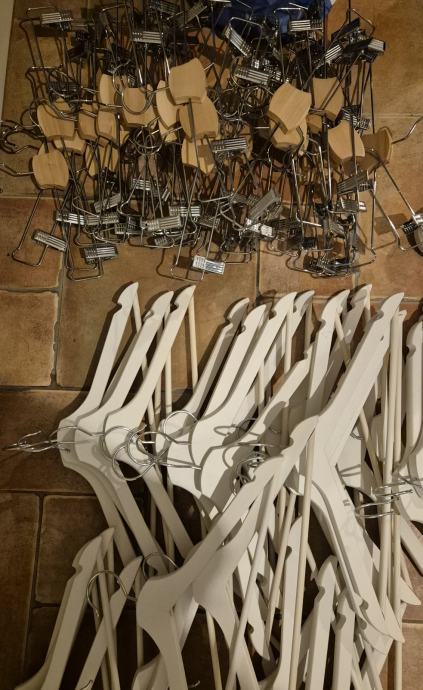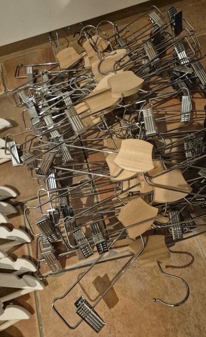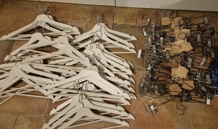Vješalice, dvjesto komada, drvene. 150 bijelih i 50 smeđih sa štipaljkama. Većinom nekorištene, a neke su kratko korištene. Cijena je za svih 200 vješalica.