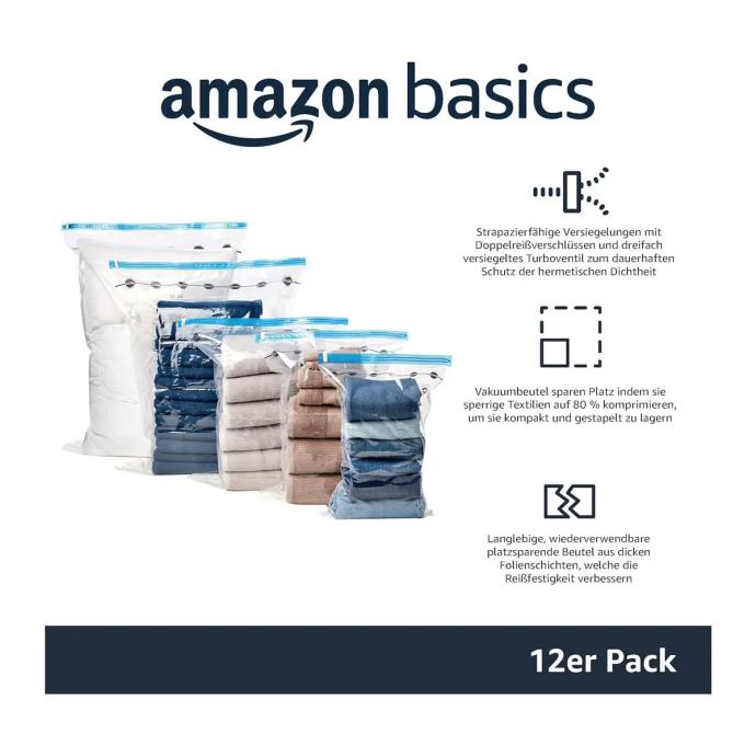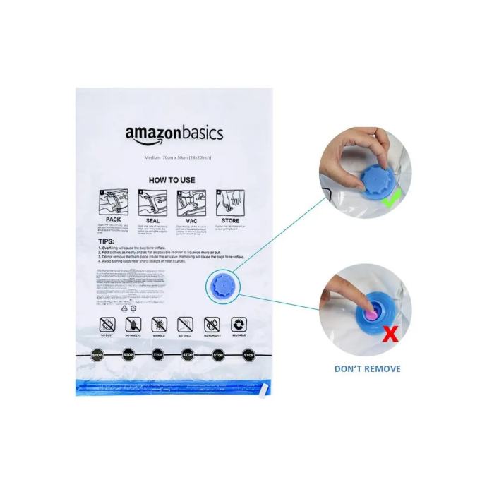 AmazonBasics 5-dijelni set vakuumskih vreća za pohranu s ručnom pumpom pruža praktično rješenje za pohranu sezonske odjeće, posteljine, ručnika i drugih tekstilnih predmeta.