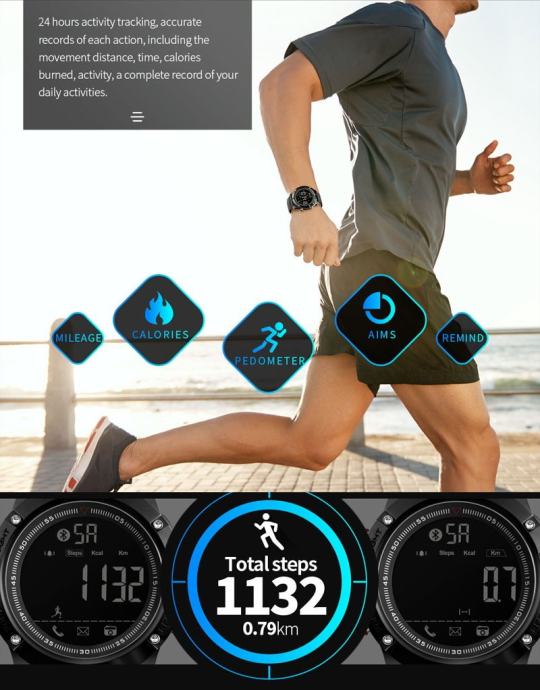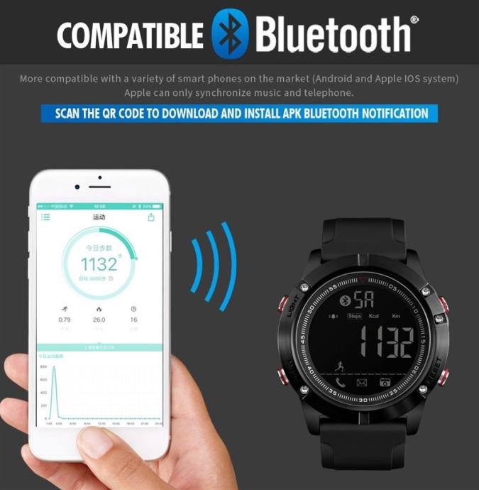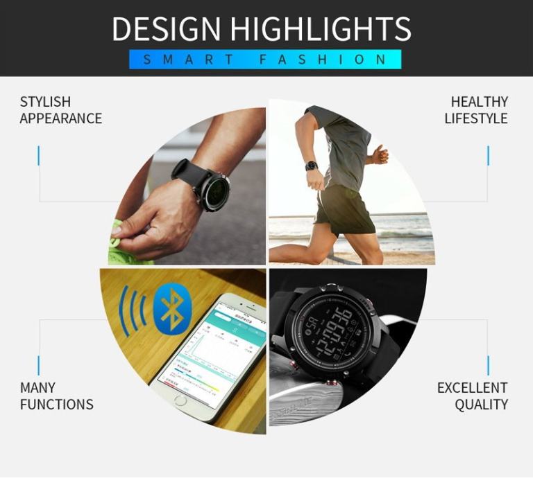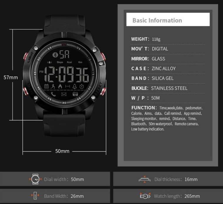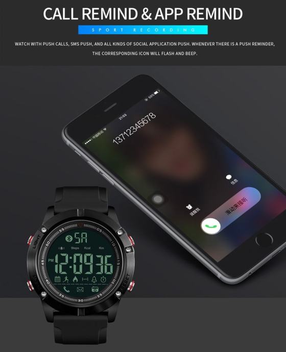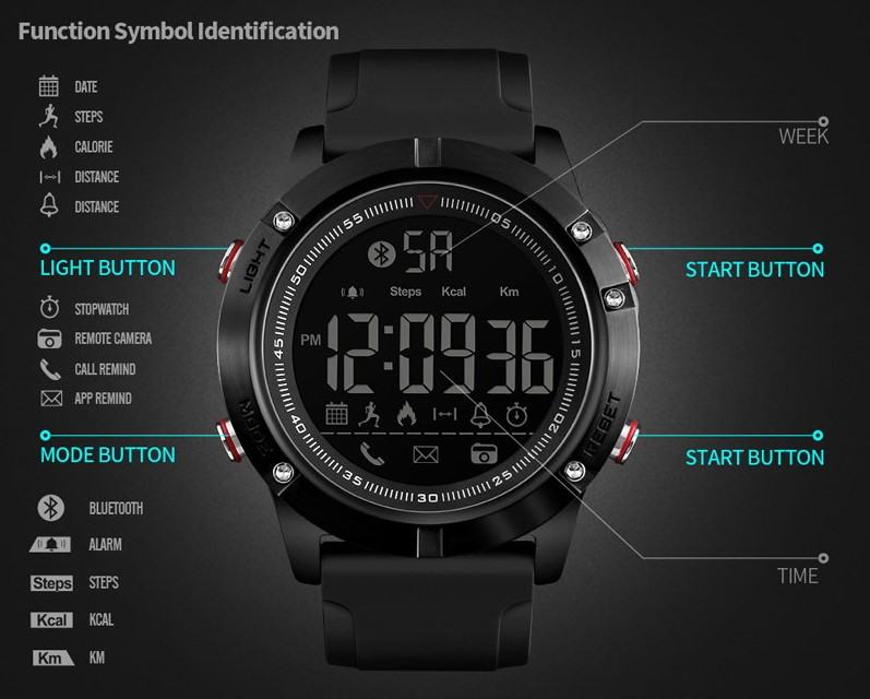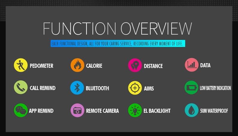 Višenamjenski sat: Vrijeme, Tjedan, Datum, Brojač koraka, Udaljenost, Kalorije, Ciljevi, Podsjetnik na poziv, Podsjetnik na aplikaciju, Monitor za spavanje, Podsjetnik,Bluetooth, 50 m vodootporan, Kamera na daljinsko upravljanje, Indikator niske baterije, LED pozadinsko osvjetljenje.