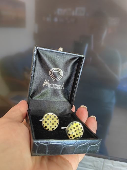 Prodajem muške manžete u elegantnom dizajnu s okruglom glavom u žuto-crnoj šahovskoj kombinaciji. Manžete su od brenda Moda i dolaze u originalnoj kutiji. Izrađene su kvalitetno s metalnim mehanizmom za kopčanje. Odličan dodatak uz svečanu košulju.