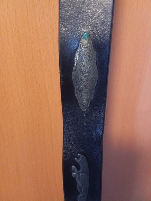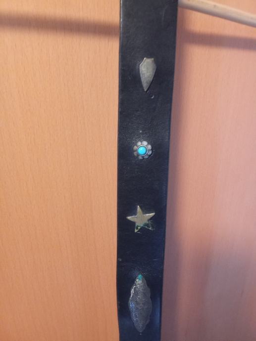 Prodajem rabljeni crni kožni remen dužine 110 cm s ukrasnim detaljima poput zvjezdica i metalnih aplikacija. Kaiš ima zanimljivu ukrasnu kopču i nekoliko dekorativnih elemenata duž cijele površine. Idealan je dodatak za svakodnevne ili posebne prilike.