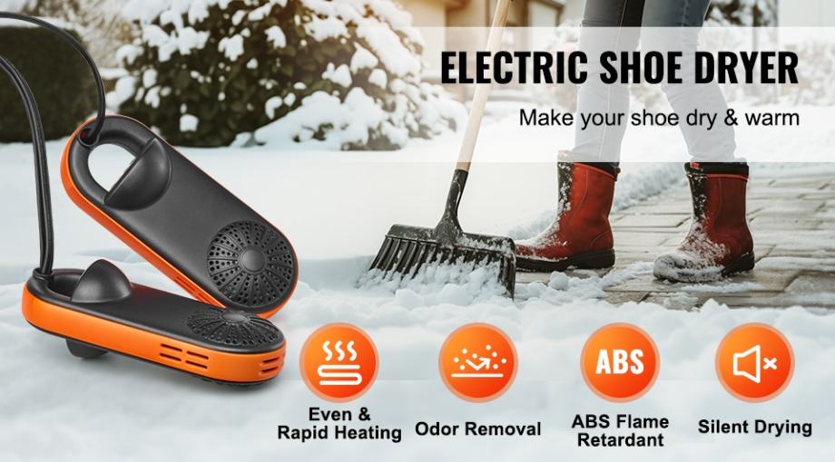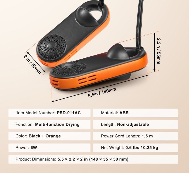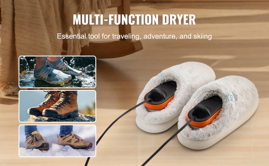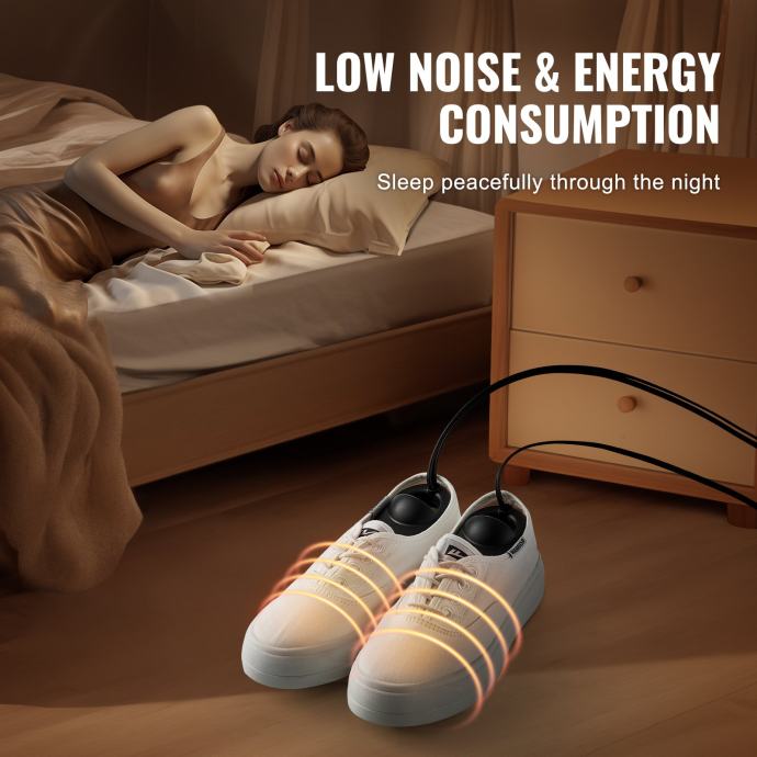 Sušilo/grijač cipela ima snagu od samo 6 W, što je puno manje od standardne žarulje; također radi vrlo tiho, što ga čini prikladnim za korištenje noću bez ometanja vašeg odmora. Tijekom korištenja provjerite jesu li vaše cipele suhe i isključite struju i skinite cipele kada se sušenje završi.