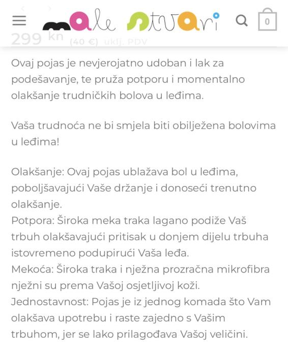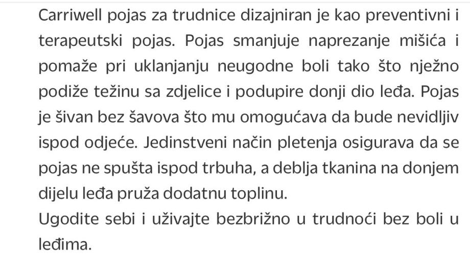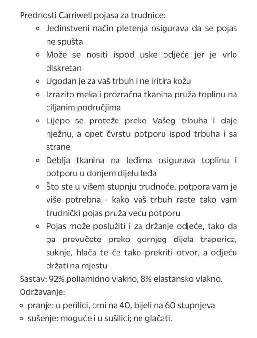 Prodajemo potporni pojas za trudnice, veličine S/M, potpuno crne boje. Pojas je u odličnom stanju, potpuno je nov i nekorišten. Kupljen 2022. preko stranice male-stvari.hr. Detaljniji opis pojasa nalazi se u galeriji.