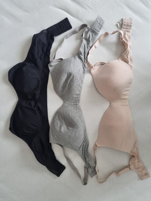 Prodajem tri grudnjaka za dojenje u različitim bojama: crnoj, sivoj i bež/roza. Sva tri komada su veličine 85D (EUR). Grudnjaci imaju klasičan dizajn s podesivim naramenicama i kopčom na leđima. Cijena 5€