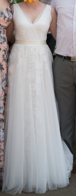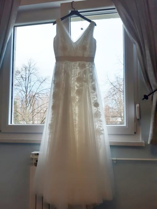 Prodajem vjenčanicu dizajnera Ivana Alduka,veličina 38.Vrlo udobna i lagana ,oblači se kao hlače,ne ide preko glave.Isprepletena cvjetnim uzorcima u više slojeva,sa šlepom koji se može podignuti.Dolazi s pončom i trakom remenom.Poklanjam Aldo pismo torbicu za mladenke i Aldo ukras za kosu,te satenski bijeli ogrtač za fotkanje ( Zlatna slova na leđima "Mlada".).Kemijski očišćeno.Cijena 5.499 kn.Preuzimanje u Zagrebu i Bjelovaru. Molim isključivo zvati na broj mobitela: 099 676 2491.