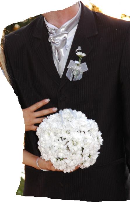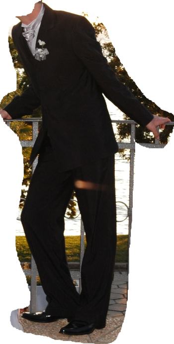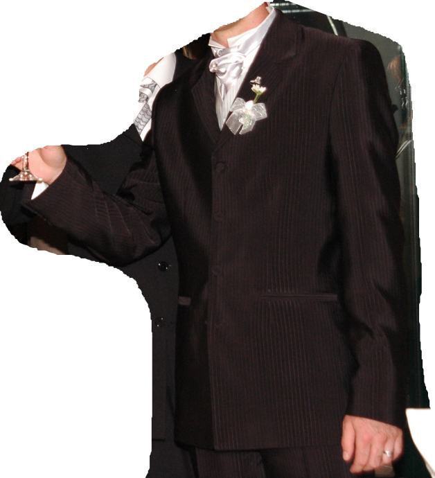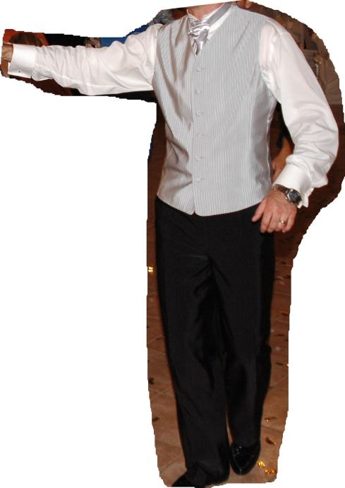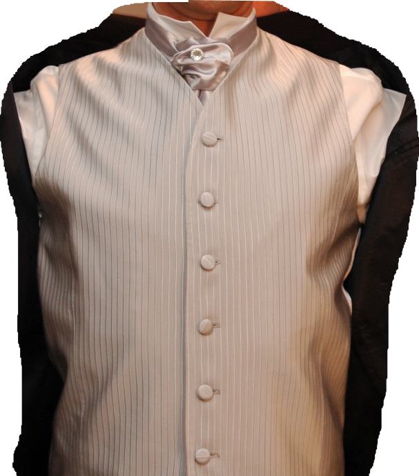 Komplet se sastoji od crnih hlača i sakoa sa laganim sjajnim prugicama, sivi/srebrni prsluk sa sjajnim prugicama, sivi plastron i košulja (bijela).
