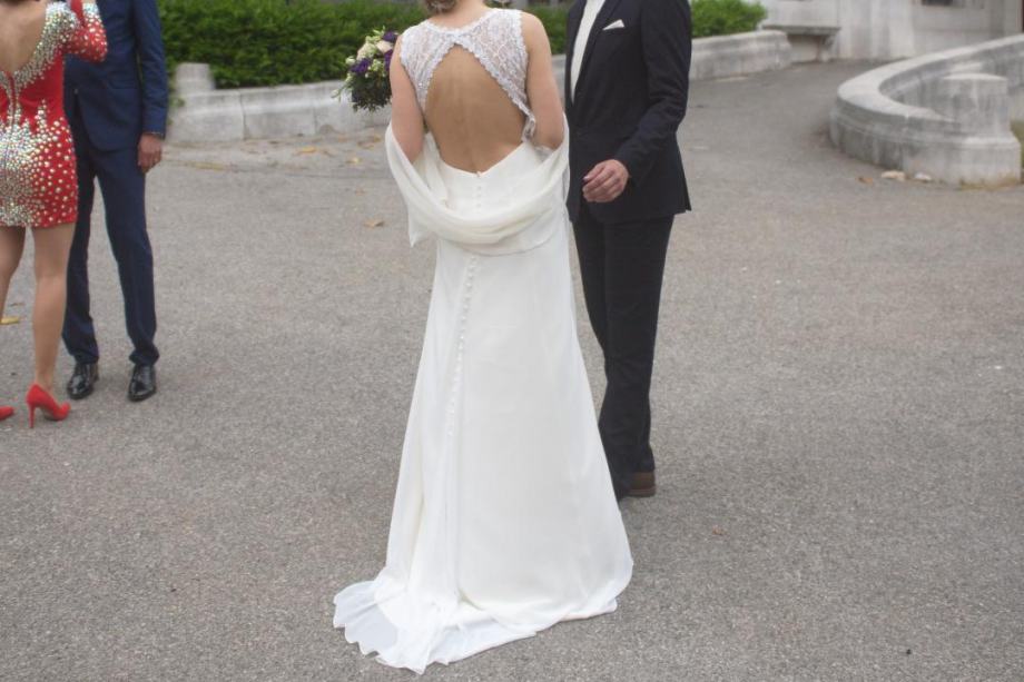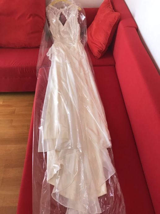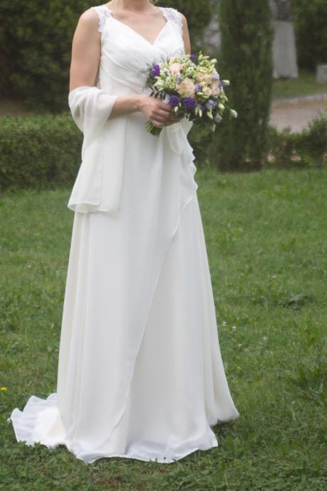 Prodajem lijepu vjenčanicu, jednom korištenu, kemijski očišćena i uredno spremljena za 190 eura.