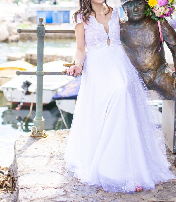 Prekrasna i lagana vjencanica sivana po mjeri za visinu 165 plus 7 cm potpetica. 15 metara svilenog tila i francuska čipka.