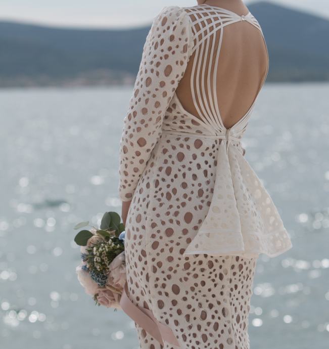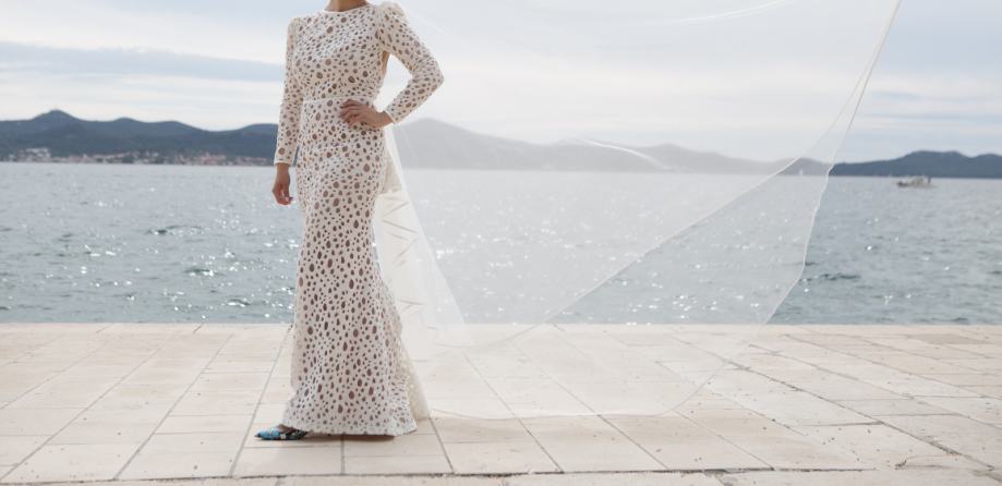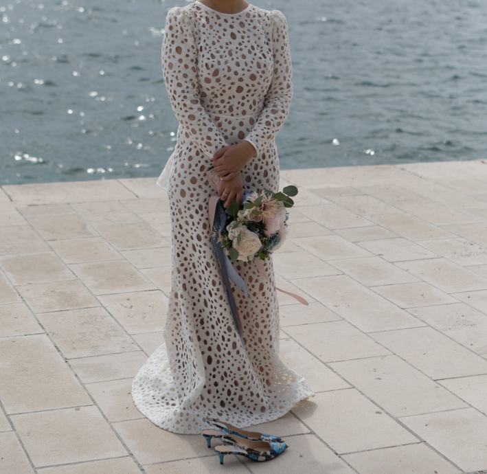 Prodajem vjenčanicu brenda eNVy room, šivanu po mjeri i nošenu jednom u svibnju 2019. (otprilike veličina 38). Vjenčanica nije oštećena te je kemijski očišćena. Podloga je boje kože sa decentnim šljokicama, a dugi rukavi se mogu skratiti. Također, uz vjenčanicu dolazi i veo koji ide uz nju.