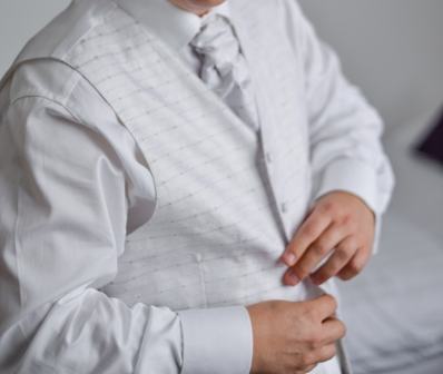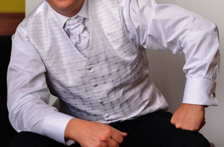 Prsluk za mladoženju marke CROATA zajedno s kravatom veličine 54. Bijela košulja s uzorkom u istom tonu veličine 41. Cijena 140 eur.