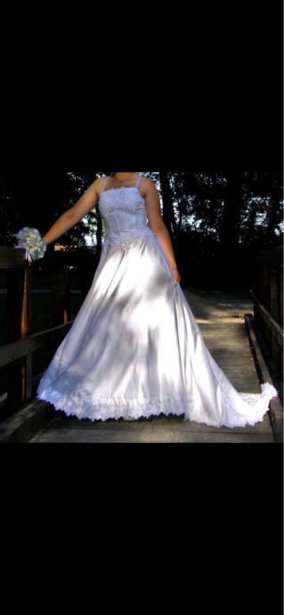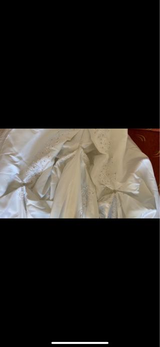 Vjenčanica, broj 42 (jednom nošena), svilena tkanina, bijele boje, u dva dijela, lijepo izvezena sa sjajnim kamenčićima. Suknja vjenčanice ima kolut koji joj daje posebnu eleganciju. Gornji dio, korzet je na vezanje i tako prilagodljiv za potrebnu veličinu, i bez naramenica. Stražnji dio suknje ima gumbe na koje se može pričvrstiti šlep vjenčanice.