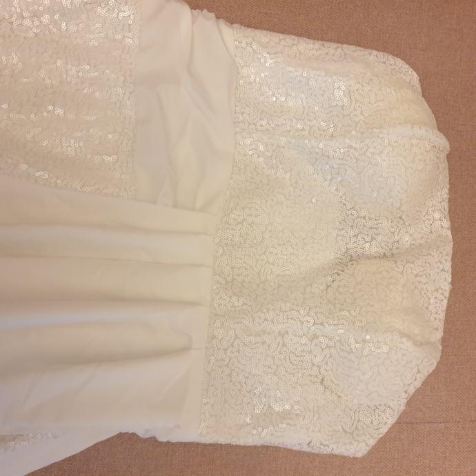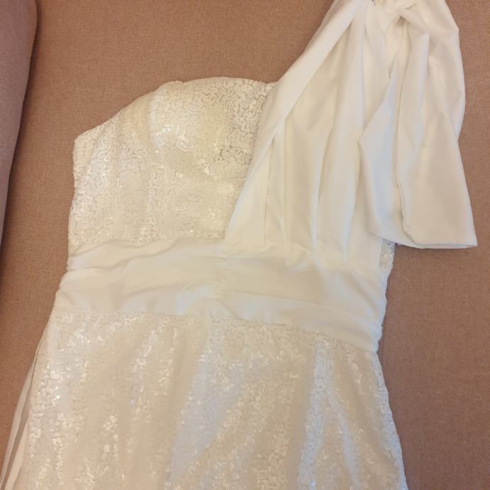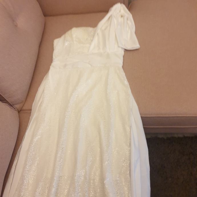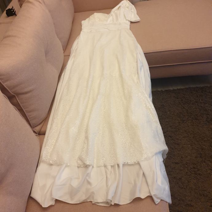 Prodajem vjenčanicu, bijele boje, nikad nošenu niti isprobanu. Veličina 40-42 (ne znam da li je to realna veličina). Vjenčanica ima satensku traku (s prednje i stražnje strane) koja se veže na lijevom ramenu i satenski šlep. Za sva pitanja molim da me se nazove.