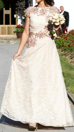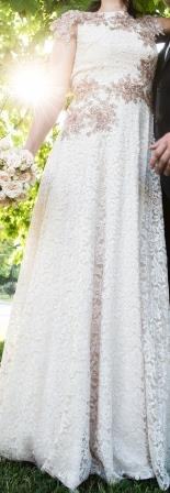 Prodajem vjenčanicu (koja može biti i svečana haljina) dizajnera Ivice Skoke. Konfekcijski broj 38, dužina haljine (mjerena od vrata) 150 cm. Haljina je bež boje, čipka, sa ušivenim prljavo rozim perlicama. Nošena jednom i očišćena u kemijskoj čistionici. Uz vjenčanicu poklanjam cipele ukoliko broj odgovara (broj 39).