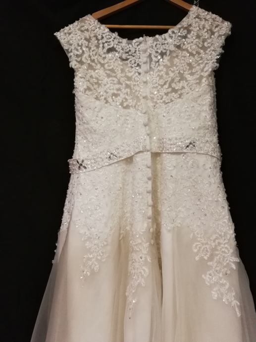 Vjenčanica šivana po mjeri otprilike za broj 44-46 i grudi kosarica manji D a mogao bi proci i za veći C.